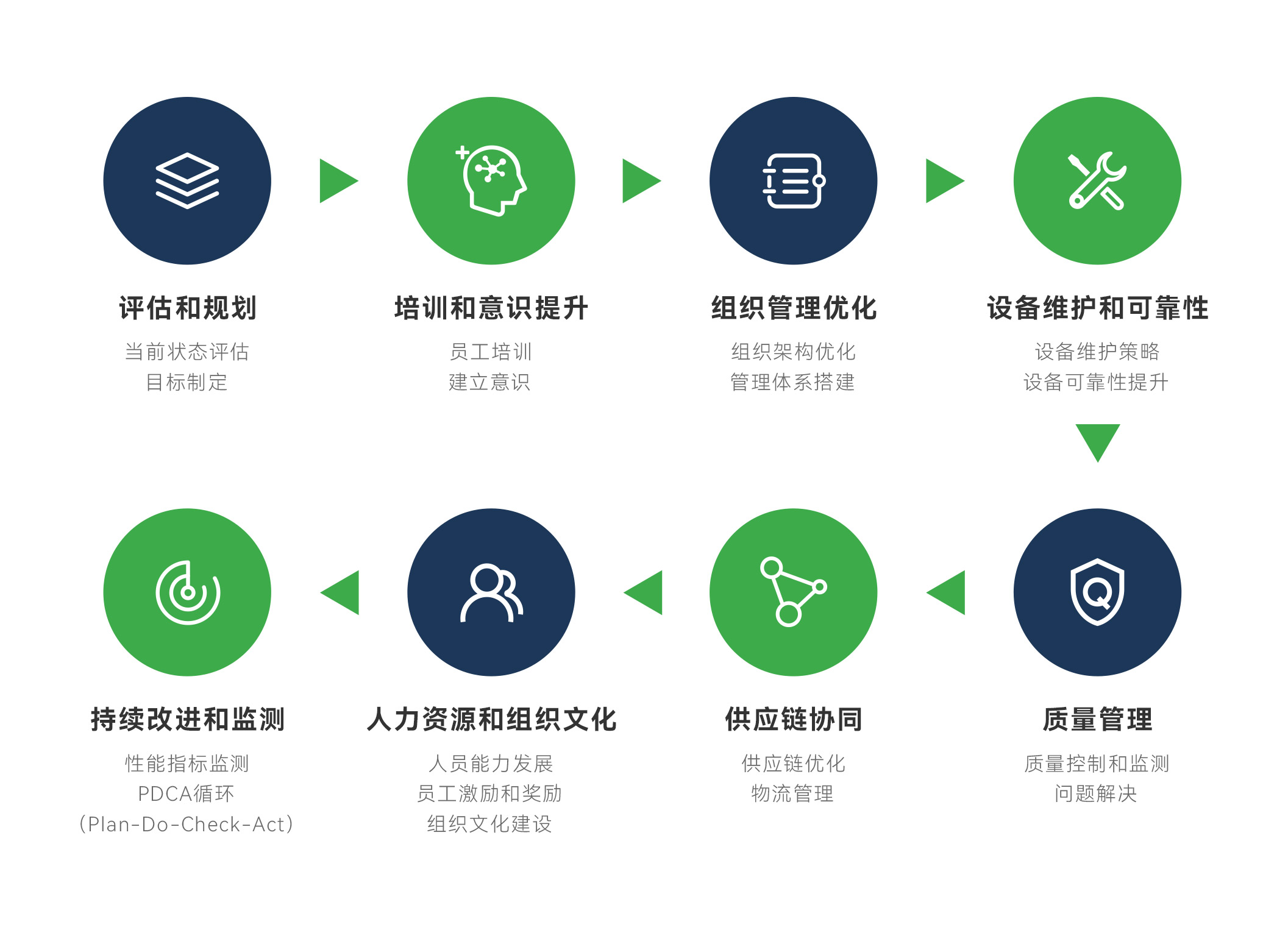 通过操作工对设备的自主维护,工程维修人员对设备的专业维护以及专业的项目管理和维护来提升设备效能。